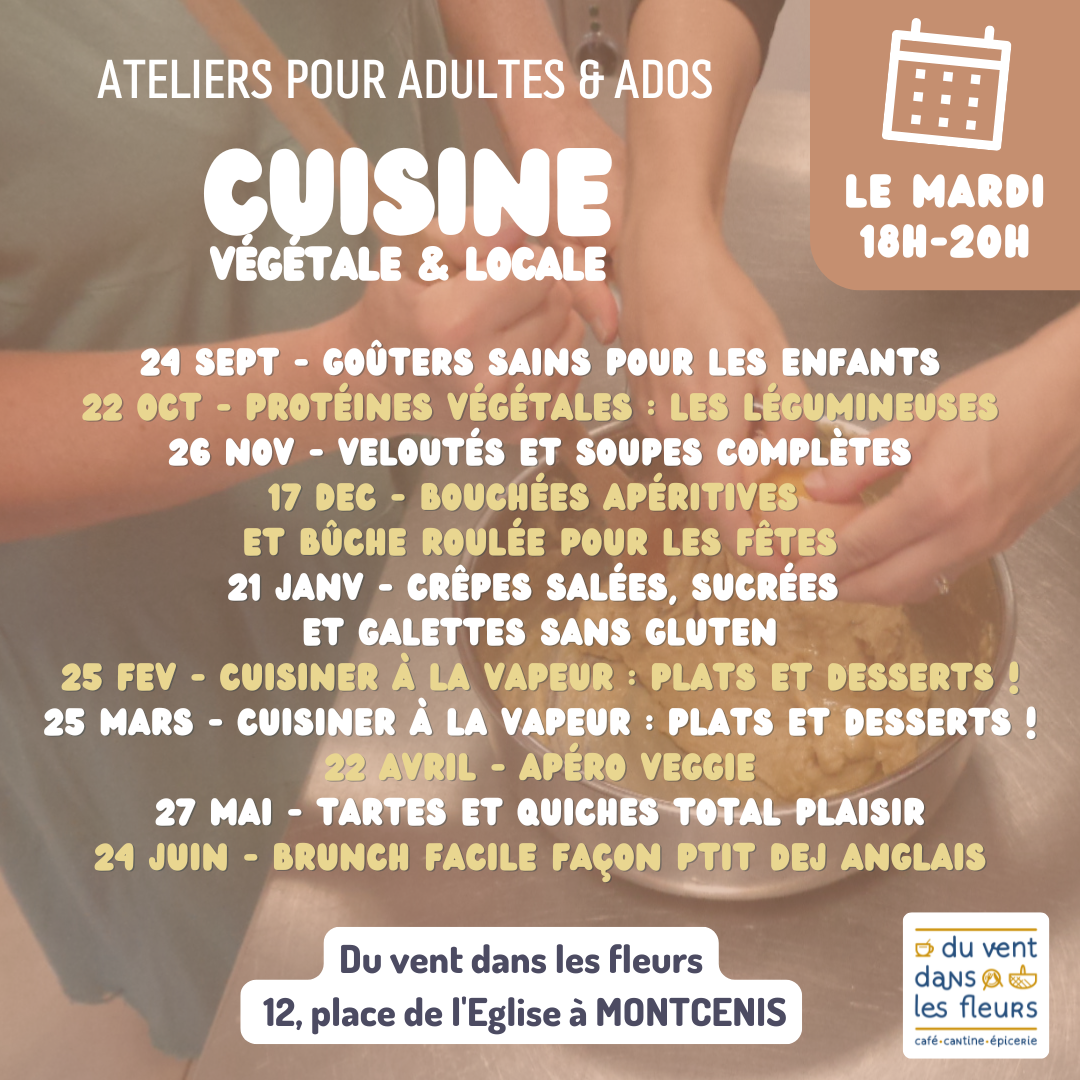 👩🍳 Grâce à nos ateliers, venez (ré)apprendre les bases d’une cuisine simple & saine du quotidien, avec une grande majorité d’ingrédients très locaux (issus de notre épicerie). 😋